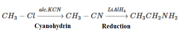 Note: Another way of preparing ethyl amine prepared from methyl iodide is by using cyanohydrin reduction. Methyl iodide first is converted into methyl chloride using the ion-exchange method: \[C{H_3}I{\text{ }} + {\text{ }}NaCl{\text{ }} \to C{H_3}Cl\; + {\text{ }}NaI\].