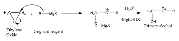 Thus, we can conclude that Ethylene oxide reacts with Grignard reagent to give a primary alcohol.