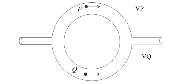 Hint Volume of liquid pass through the main tube per second is equal to sum of volume of liquid pass through the both semi-circular tubes per second. We know that the volume of liquid passing through a cross section in one second is a product of the cross-sectional area and speed of liquid. We just find the rate of flow in P and Q, and equate then with the rate of flow of the main tube.