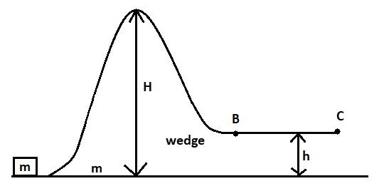 Figure shows an irregular wedge of mass $m$ placed on a smooth horizontal surface. Horizontal part $BC$ is rough. The other part of the wedge is smooth. What minimum velocity should be imparted to a small block of same mass $m$ so that it may reach point $B$ .