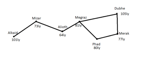Find distance in light years from Alkaid to Merak.