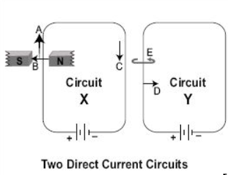 Arrow D shows the direction of repulsion force exerted by wire in circuit X to the wire of Y because the direction of current in both parallel wires is opposite.