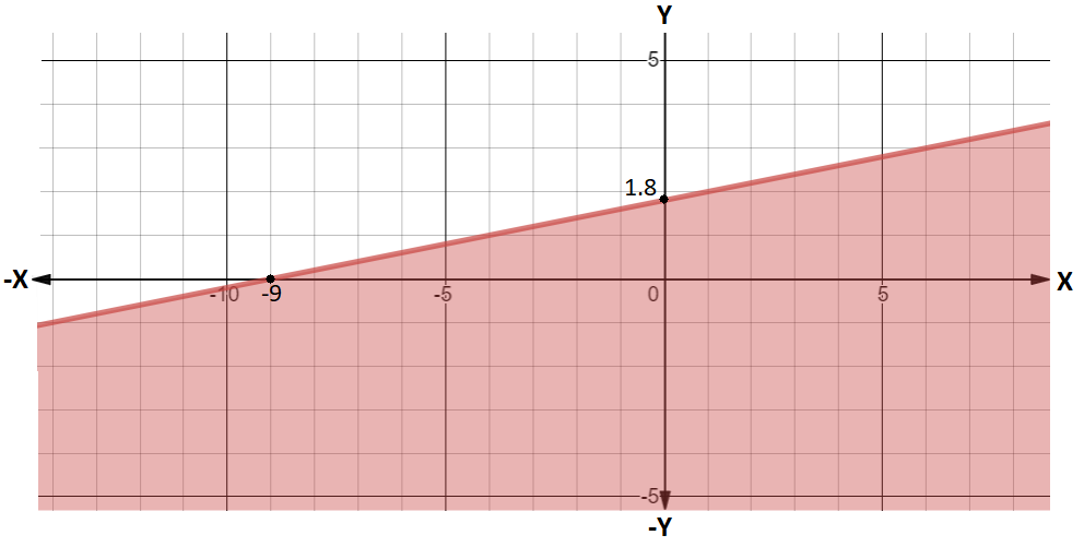 This gives us two equations of the line. Let’s consider $5y - x - 9 \leqslant 0$ first and try to find the intercept points on x-axis and y-axis. For x-intercept, we can put $y = 0$ and for y-intercept, we can put $x = 0$