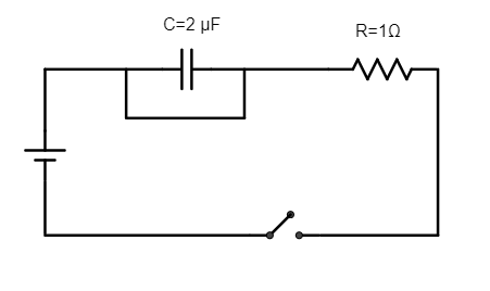 A capacitor of $C = 2\mu {\text{F}}$ is connected in series with a resistor of resistance $R = 1\Omega $ and connected to a battery. The capacitor is shorted.