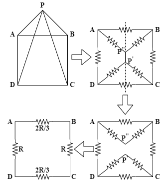 To find: The equivalent resistance for any base branch of the square pyramid. Here, we’ll try to find equivalent resistance across CD.