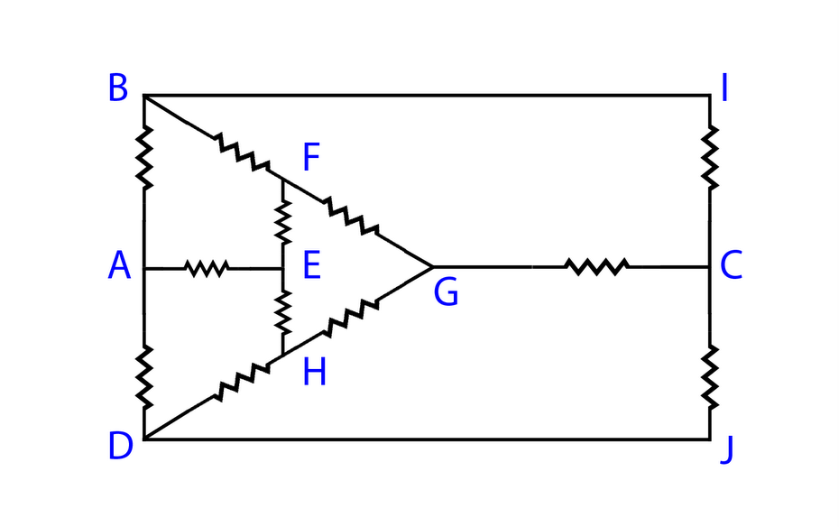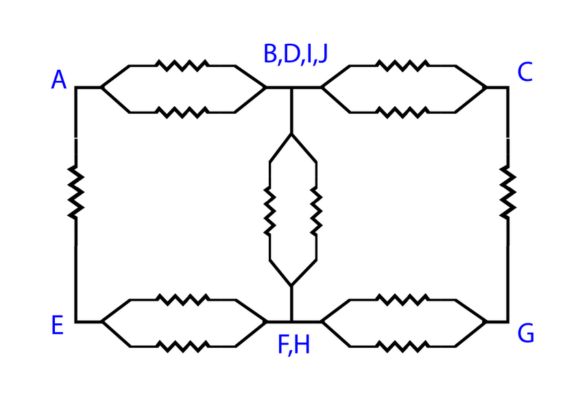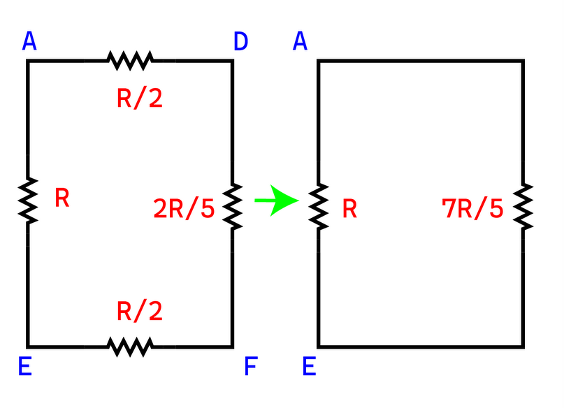 \[\dfrac{1}{{{R_E}}} = \dfrac{1}{R} + \dfrac{1}{{\left( {\dfrac{{7R}}{5}} \right)}} = \dfrac{1}{R} + \dfrac{5}{{7R}} = \dfrac{{12}}{{7R}} \Rightarrow {R_E} = \dfrac{{7R}}{{12}}\]