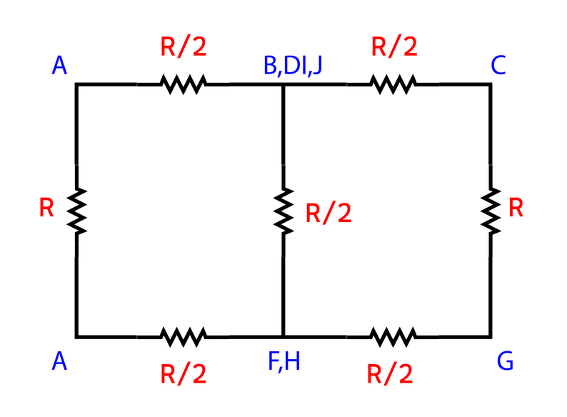 \[\dfrac{1}{{{R_E}}} = \dfrac{1}{R} + \dfrac{1}{R} = \dfrac{2}{R} \Rightarrow {R_E} = \dfrac{R}{2}\]