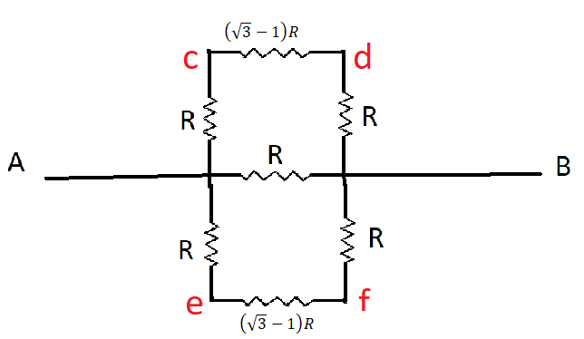 \Rightarrow {R_{eq}} = \dfrac{{\left( {\sqrt 3 + 1} \right)R}}{{\sqrt 3 \left( {1 + \sqrt 3 } \right)}} \\