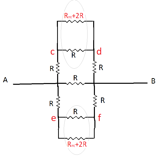 The top three resistance marked above the red line are taken as ${R_{eq}}$ the same case is at the bottom also and their values will also be the same, so we substitute ${R_{eq}}$in place of them. So now our image looks like
