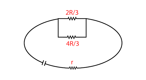 ${R_E} = \dfrac{{\dfrac{{2R}}{3} \times \dfrac{{4R}}{3}}}{{\dfrac{{2R}}{3} + \dfrac{{4R}}{3}}} = \dfrac{{4R}}{9}$