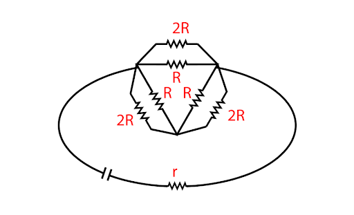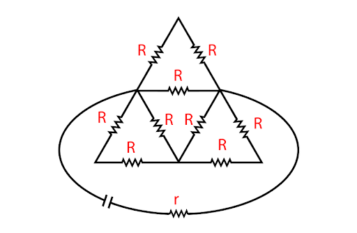 In the triangle part of the circuit, the three sides have two resistances in a series connection. Their equivalent resistance will be ${R_E} = R + R = 2R$. The circuit diagram will be