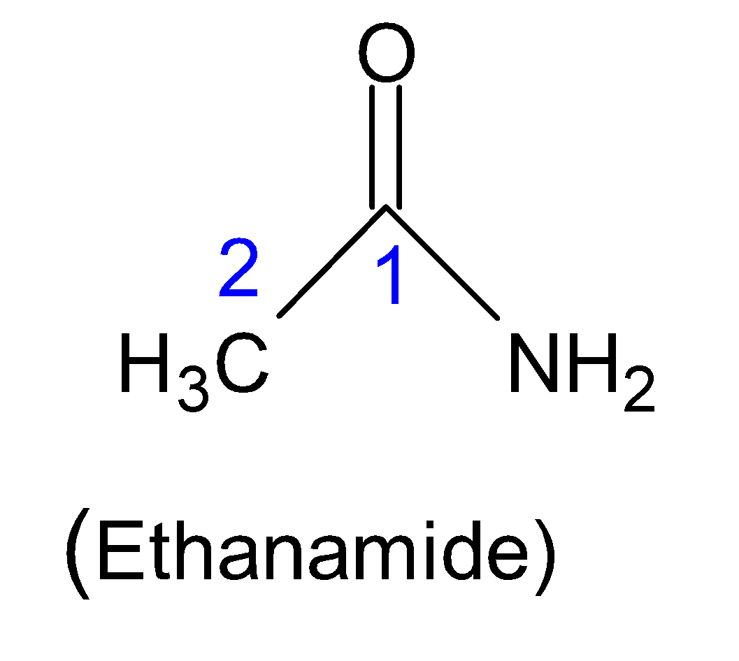 For example, the chemical formula of formic acid is $HCOOH$and the amide corresponding to formic acid is methanamide,$HCON{{H}_{2}}$.Similarly methanoic acid $C{{H}_{3}}COOH$and its corresponding amide are ethanamide, $C{{H}_{3}}CON{{H}_{2}}$.