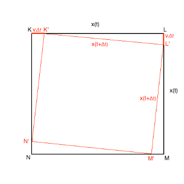 It is not hard to show that the red shape must also be a square. This is not surprising but important for our calculation. Let's take the square at an arbitrary time $t,$ with side lengths $x(t) .$ Notice that we have a right triangle with side lengths $x(t)-v \Delta t, v \Delta t,$ and $x(t+\Delta t) .$ Using the Pythagorean theorem, we obtain the equation: