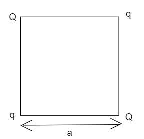 Four point charges $Q,\,q,\,Q\,$ and $q$ are placed at the corners of the square of a side $'a'$ as shown in the figure.