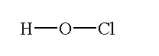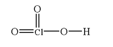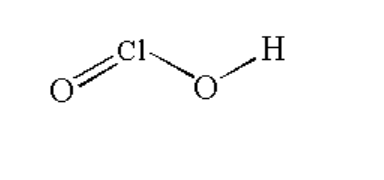 Here the chlorine atom is bonded with two oxygen atoms by a double bond and one oxygen atom by a single bond and the oxygen atom is bonded with hydrogen by a single bond.