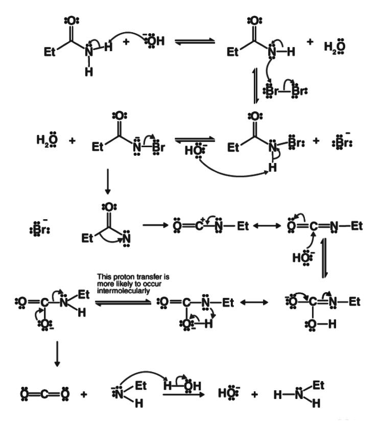 Step 4: This bromamide anion undergoes rearrangement so that the previously bonded ethyl group (or any other R- group) with the carbonyl carbon now binds with the nitrogen. The bromide anion that forms simultaneously departs from the complex. An isocyanate is produced as a result.