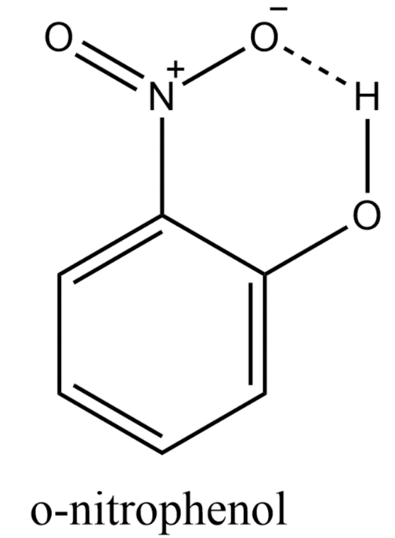Intramolecular hydrogen bonding is seen in some of the compounds where the hydrogen bond is formed inside the same molecule of the same compound. For example, the intramolecular hydrogen bonding in ortho nitrophenol is shown below.