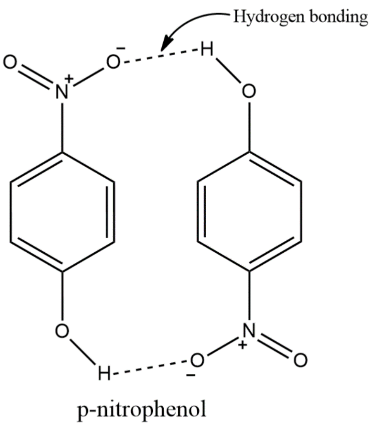 Note: Always remember that there are two types of hydrogen bondings present. One is the intermolecular hydrogen bonding, the other is the intramolecular hydrogen bonding. Intermolecular hydrogen bonding is seen in most of the compounds where the hydrogen bond is formed between two different molecules of the same compound. For example, the intermolecular hydrogen bonding in para nitrophenol is shown below.