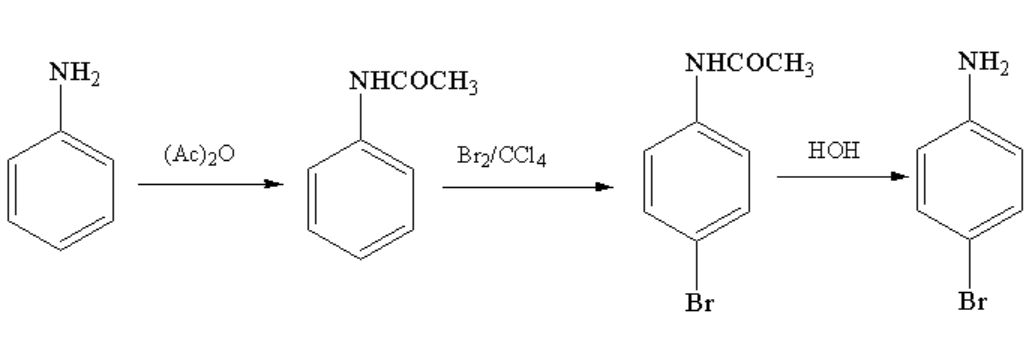 \[{C_6}{H_5}N{H_2} \overset{(Ac)_{2}O}{\rightarrow} X \overset{Br_{2}/CCl_{4}}{\rightarrow} Y \overset{HOH}{\rightarrow} Z\]
