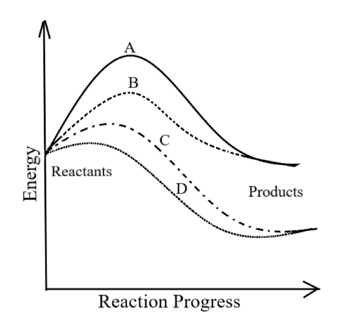 A refers to an uncatalyzed endothermic reaction. As it requires maximum activation energy for initiating the reaction, hence it is an uncatalyzed reaction. Also, as the energy of the product is greater than the energy of the product, hence it is an endothermic reaction.