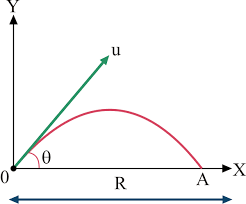For a projectile motion the horizontal distance traveled by a body during the time of flight is range. Assuming that the staring and the end point are at equal height, the range of the projectile (R) is given by