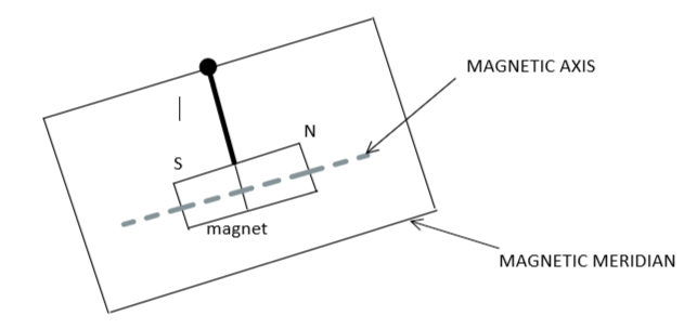 Since the magnetic meridian is parallel with the earth’s magnetic lines of force, therefore, whenever a magnet is freely suspended in the air along its magnetic axis then it will stop in Earth’s Magnetic Meridian.