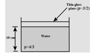 It is given that real depth is 10 cm and μ can be written as \[{}_g{\mu _w} = \dfrac{{{\mu _w}}}{{{\mu _g}}}\] where, \[{\mu _g} = \dfrac{3}{2};{\mu _w} = \dfrac{4}{3}\]