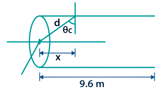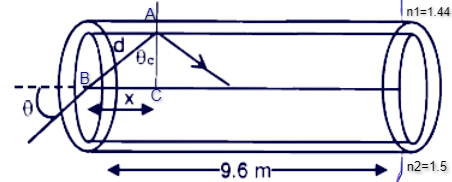If at angle θ the light takes maximum time to travel in optical fiber. Then the maximum time is $y\times {{10}^{-8}}s$, calculate $y$. (n1=1.44 , n2=1.5)