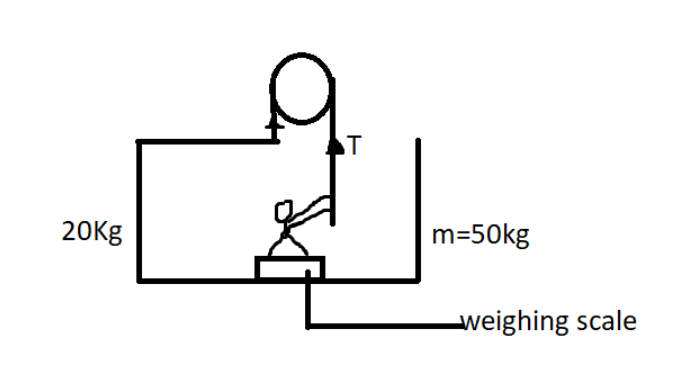 If man is balanced with a system, find Tension, reading of the weighing machine.