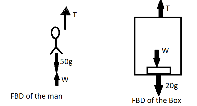 Let the tension applied on the rope be T. Now, the mass of the man and the mass of the box are the downward force acting on the whole system, assuming that the weight of the machine is negligible. There are two upward forces of T acting on the rope. Draw the FBD of the given scenario.