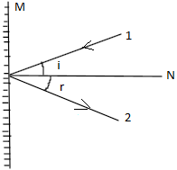 The diagram shown above is an instance of reflection. Here ‘N’ is the normal to the reflecting surface ‘M’. ‘1’ shown here is the ray of incidence which forms $\angle i$ with ‘N’ and ‘2’ is the reflected ray which leaves at $\angle r$ with ‘N’. Here $\angle i$ and $\angle r$ will both be equal due to the law of reflection.