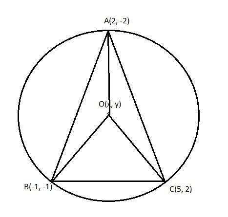 If the vertices of a triangle area unit (2, −2), (−1, −1), and (5,2) then the equation of its circumcircle is?
