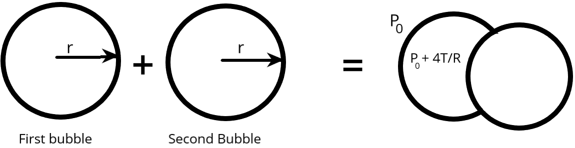 Note: It should be noted that the excess pressure of the first bubble is two times than the second bubble that’s why the equation of the first bubble is ${P_0} + \dfrac{{4T}}{r} + \dfrac{{4T}}{r}$ instead of ${P_0} + \dfrac{{4T}}{r}$. And when the two bubble soaps' radii aren't equal, air moves from the smaller bubble into the larger one, which causes the larger bubble to expand and the smaller one to diminishes.