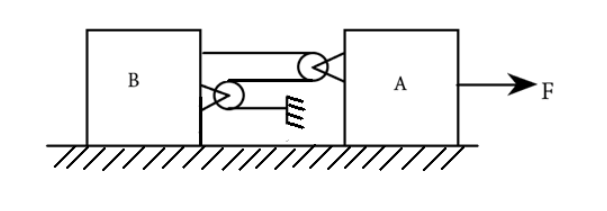 If work done by string on block A is W. shown in the given arrangement, then the work done by the string on block B is
