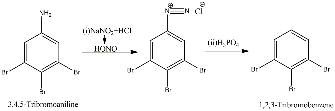 Hint: 3,4,5-Tribromoaniline is a compound containing primary aromatic amine with three bromine groups at 3, 4 and 5 positions of aniline. Here in the first step diazotization is performed and then acid is given which will provide its proton in the reaction. Diazotization reaction is a type of coupling reaction for primary amine compounds.