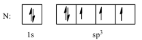 We know that the number of valence electrons in the nitrogen atom is 7. The electronic configuration of nitrogen is $1{{s}^{2}}2{{s}^{2}}2{{p}^{3}}$. So, the ground state and hybridized state of the nitrogen atom will be: