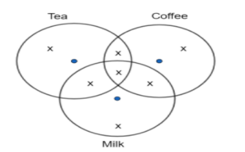 Hint: The number of employees who like only Tea, Coffee, and Milk is equal to x. The number of employees who like only tea and coffee, only coffee and tea, and only tea and milk is equal to x. The number of employees who like all three is equal to x, \[\left( T\cap C\cap M \right)\] = x. Using these all pieces of information, draw a Venn diagram. Now, get the total number of employees who are included in the tea circle, coffee circle, and milk circle that is, \[n\left( T \right)\] , \[n\left( C \right)\] , and \[n\left( M \right)\] respectively. Then, get the total number of employees who are included in the tea and coffee circle, coffee and milk circle, and tea and milk circle that is, \[n\left( T\cap C \right)\] , \[n\left( C\cap M \right)\] , and \[n\left( T\cap M \right)\] respectively. We have to get the total number of employees that is \[\left( T\cap C\cap M \right)\] . Use the formula,