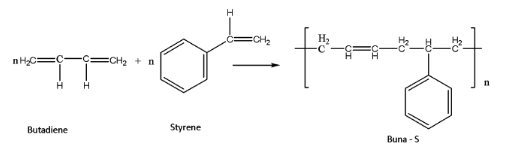 Buna – S is formed using the monomers butadiene and styrene. The reaction of this process can be given as: