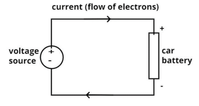 As we recognize that the flow of electrons is constantly from higher voltage supply to lower voltage supply. In the case of battery charging of a motor vehicle, the source voltage needs to be more than the battery voltage. In any other case reversal of flow of electrons happens.