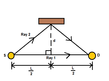 In figure the sound of wavelength $0.850m$ is emitted isotropically by point source S. Sound ray 1 extends directly to detector $D$, at distance $L=10.0m$. Sound ray 2 extends to D via a reflection (effectively, a “bouncing”) of the sound at a flat surface. That reflection occurs on a perpendicular bisector to the $SD$ line, at distance $d$ from the line. Assume that the reflection shifts the sound wave by $0.500\lambda $. For what value of $d$ (other than zero) do the direct sound and the reflected sound arrive at $D$ exactly out of phase?