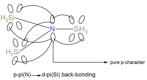 We can understand from the above discussion that due to $p\pi \left( N \right)\to d\pi \left( Si \right)$ back-bonding and steric factors, ${{\left( Si{{H}_{3}} \right)}_{3}}N$ it is $s{{p}^{2}}$ hybridised and ${{\left( C{{H}_{3}} \right)}_{3}}N$ nitrogen is $s{{p}^{3}}$ hybridised.