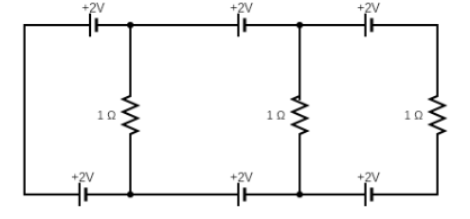 The given circuit can be split into 3 loops , loop 1 consisting of two 2V source and 1 ohm resistor and the second loop consisting of two 2V source and two 1 ohm resistors and the final loop similar as the second loop.