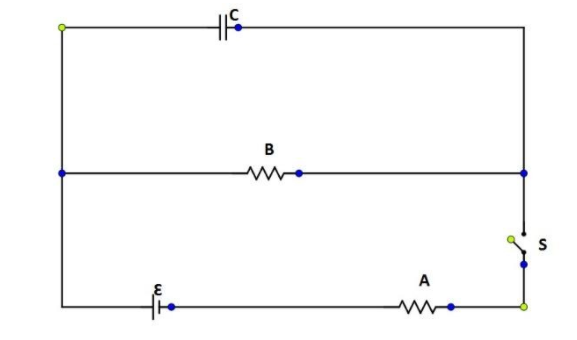 Complete step by step answer: Given in question, A and B are equal resistances. A and B resistors are connected in a parallel circuit. Capacitor C is connected in parallel with this circuit. When S is closed, the capacitor C charges from the cell of emf $\varepsilon $ and reaches a steady state.