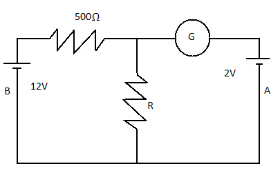 In the circuit, the galvanometer G shows zero deflection. If the batteries A and B have negligible internal resistance, the value of resistor R will be: