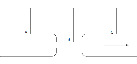 Note: Near the junction of the pipe $B$, the pressure is greater than the pressure of the liquid near the junction of the pipe $A$ and the junction of the pipe $C$. Due to the high pressure and the small diameter of the pipe $B$, the height of the liquid in the pipe $B$ is little small when compared to the height of the liquid in the pipe $A$ and pipe $C$.