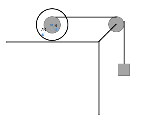 In the figure shown mass of both, the spherical and block is m. The moment of inertia of the spherical body about the center of mass is \[2m{R^2}\]. The spherical body rolls on a horizontal surface. There is no slipping at any surfaces in contact. The ratio of kinetic energy of the spherical body to that of block is