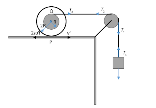 Let the linear velocity of the center of mass of the spherical body is \[v'\]and the velocity of the block attached is \[v\]. If the angular velocity of the spherical body is \[\omega \].