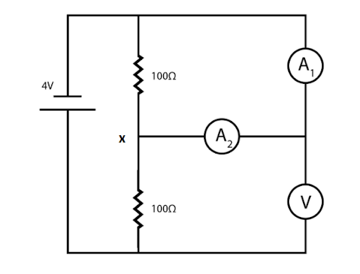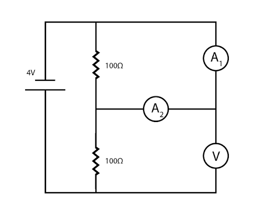 The voltage drop across the voltmeter is 3V. The emf is 4V. So the voltage across the ammeter ${A_1}$ is 1V. The resistance of the two ammeters will be $100\Omega $.