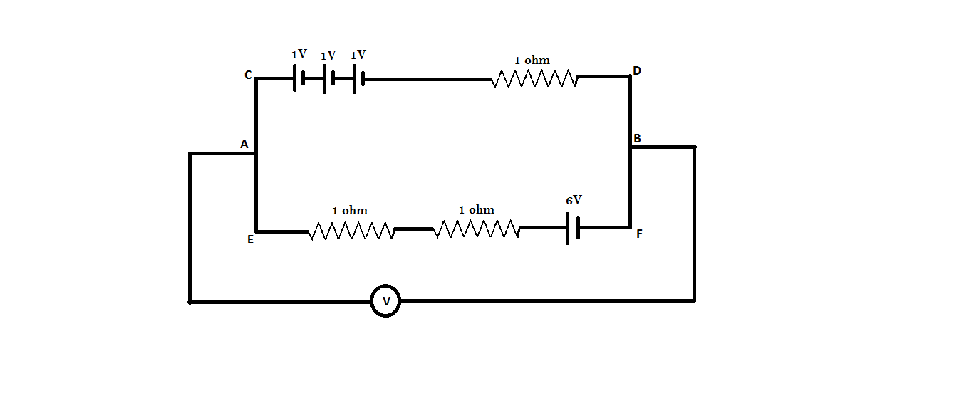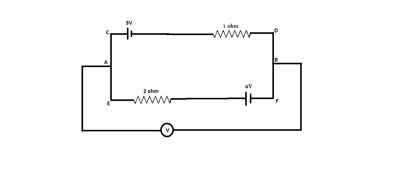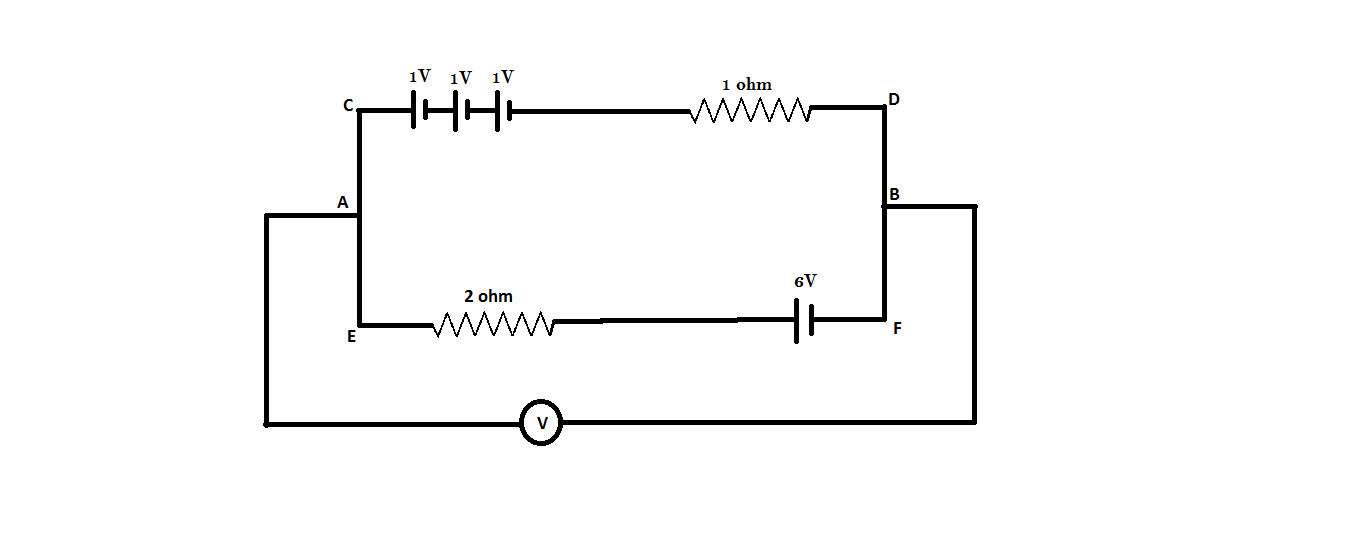 Hint: A voltmeter is an instrument used for measuring the electric potential difference between two points in an electric circuit. In the above question, we have to find the potential difference between two points A and B. Use Kirchhoff’s second law of the circuit. Kirchhoff's second law states that the voltage around a loop equals the sum of every voltage drop in the same loop for any closed network and also equals zero. Another thing to keep in mind is that the voltmeter which is connected to the circuit is ideal. An ideal voltmeter is a voltmeter that has infinite resistance, that is, the voltmeter will not allow any amount of current to go through it.
