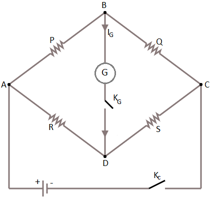 Principle of wheatstone bridge: The wheatstone bridge principle states that if for resistance $P,Q,R\,{{\& S}}$ are arranged to form a bridge with a cell and key between $A$ and $C$ and a galvanometer between $B$ and $D$ the bridge is said to be balanced when the galvanometer shows no deflection.